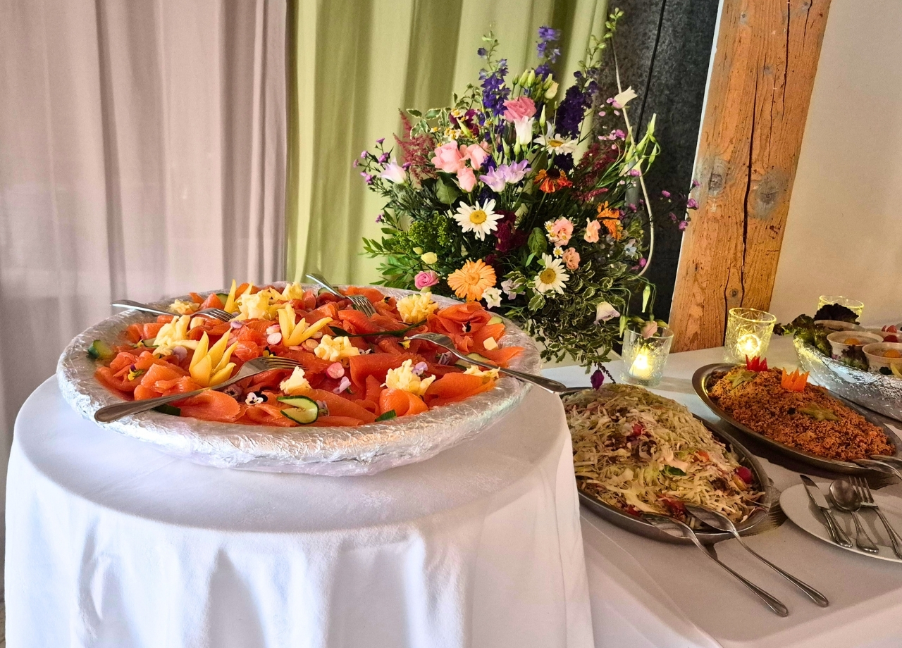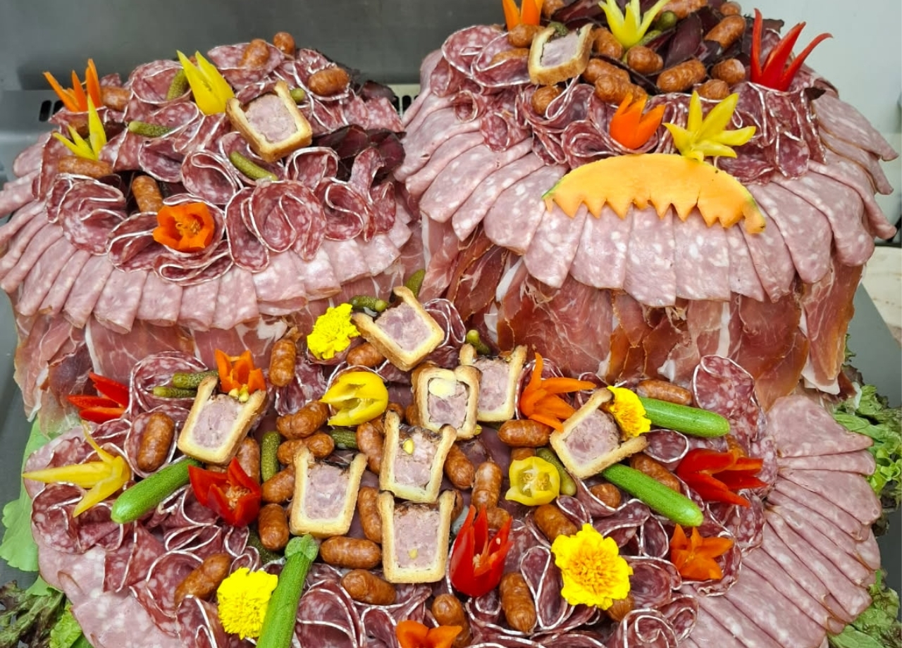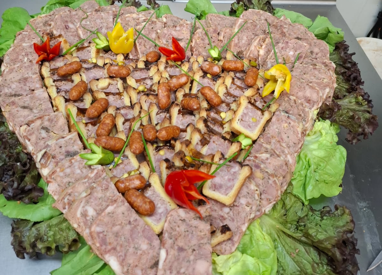 Darne de saumon farcie à la Parisienne, médaillon de sandre, croûte au morilles, terrine de saumon ou St Jacques, assortiment de charcuterie (6 sortes) Minimum 20 pers. pour présentation en cascade Terrine Jurassienne Rosbeef froid Rôti de porc froid Pilon de poulet… De quoi ravir tous les palais.